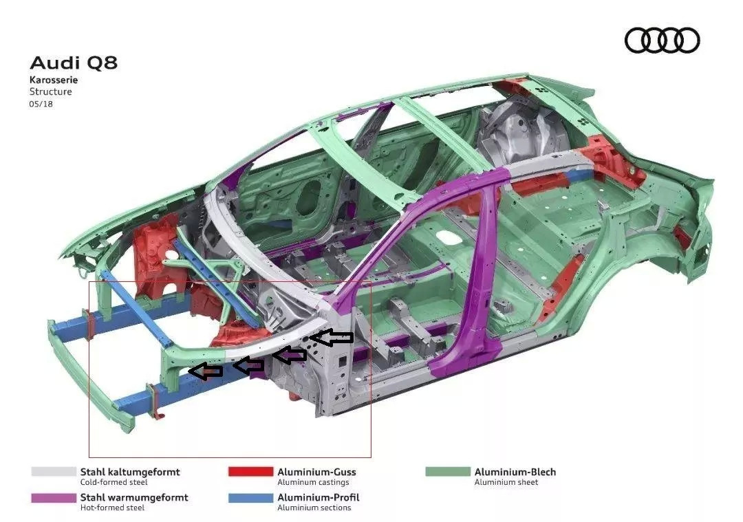 「滑出」概念不难理解,就是打太极,把力给卸掉。我们还是拿上面的奥迪Q8和沃尔沃S60举例,可以看到图中黑色箭头区域带有弧度,防撞梁两侧也设计了圆弧过渡,这样一来力打到车身上时会把车身顺着这个轨迹滑出去。