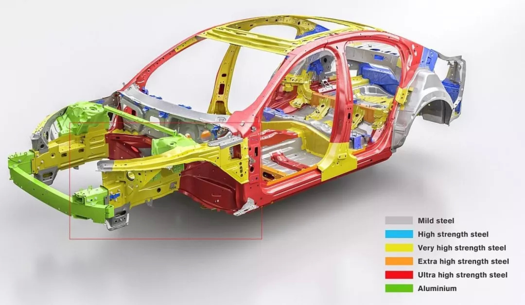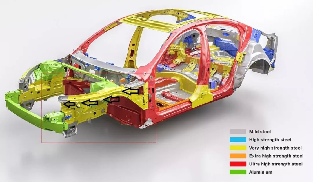 至于大家所说的偷换概念,采用强度等级不够的钢材,因为没有实质性的证据,不好妄加猜测,只说一点值得推敲的地方。美版帕萨特的车头结构如下图,其实也没有进行强化,虽然从碰撞结果看,车身发生了较大的摆动,但测试依然是通过了。这不得不让人怀疑,国内版还是在材料上有一定出入。