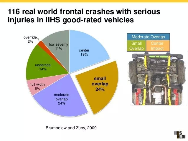 有人说我们做汽车碰撞测试是在折腾,哪里能遇到这么多万一呢。不过我没办法安慰大家,因为这项测试确实很重要。比如拿IIHS在2009年统计的当年116起真实严重事故看,small overlap(25%)比重高达24%,与关注率同样极高的Moderate overlap(40%)致死率并列第一,这样糟糕的数据促使IIHS在2012年正式开始执行25%小偏置碰测试。