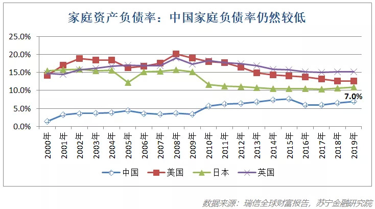 据瑞信全球财富报告数据,2019年,我国居民家庭资产负债率为7%,相比英美日等发达国家,仍有一段距离。