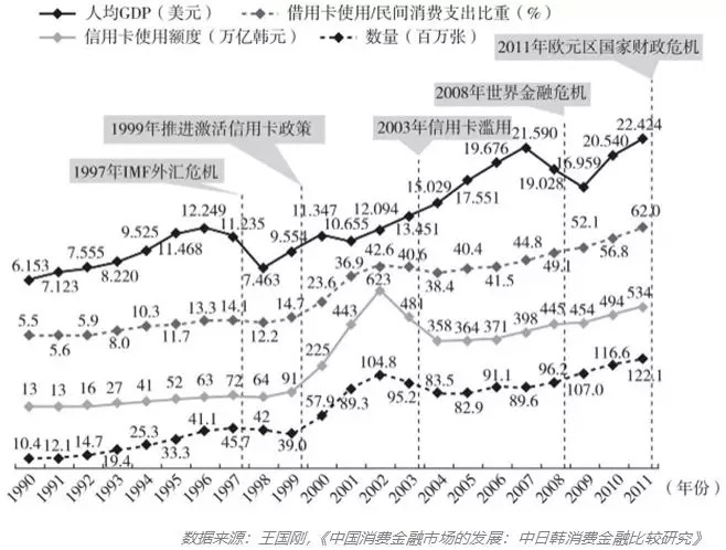 1997年亚洲金融危机之后,韩国把信用卡当作刺激内需的抓手,全面放松信用卡监管。1999-2002年间,韩国信用卡发卡量从3900万张增至1.04亿张(彼时韩国人口4800万人),人均持卡2.16张;信用卡使用额度从91万亿韩元(810亿美元)增至623万亿韩元(5253亿美元),增长5.8倍。