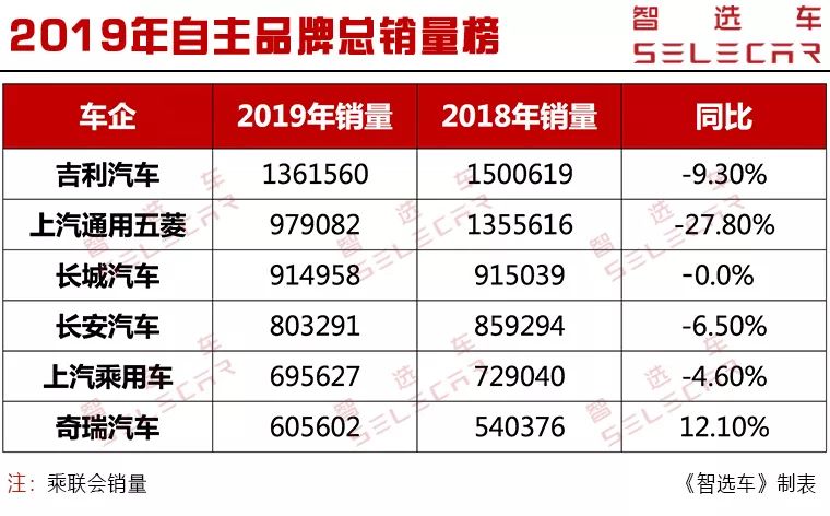 ①. 2019年,吉利汽车以136万辆的成绩夺得自主销冠,不过同比下滑9.3%;