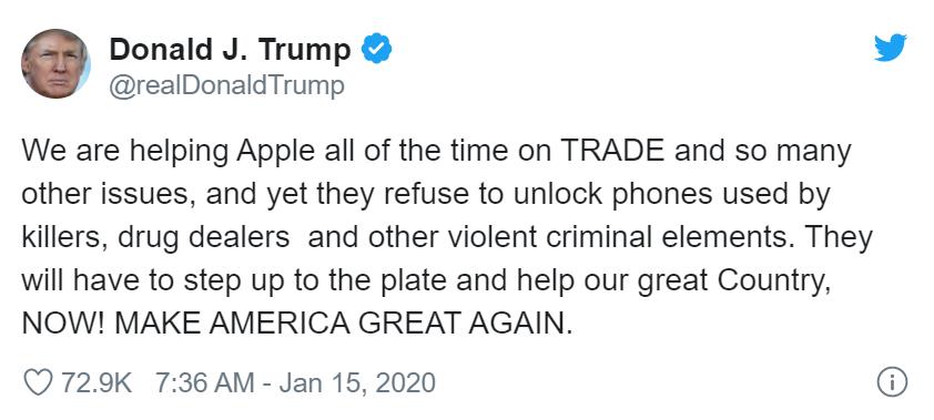 当地时间周二(1月14日),美国总统特朗普在Twitter上帮联邦调查局(FBI)控诉苹果公司不配合执法部门的调查需求。