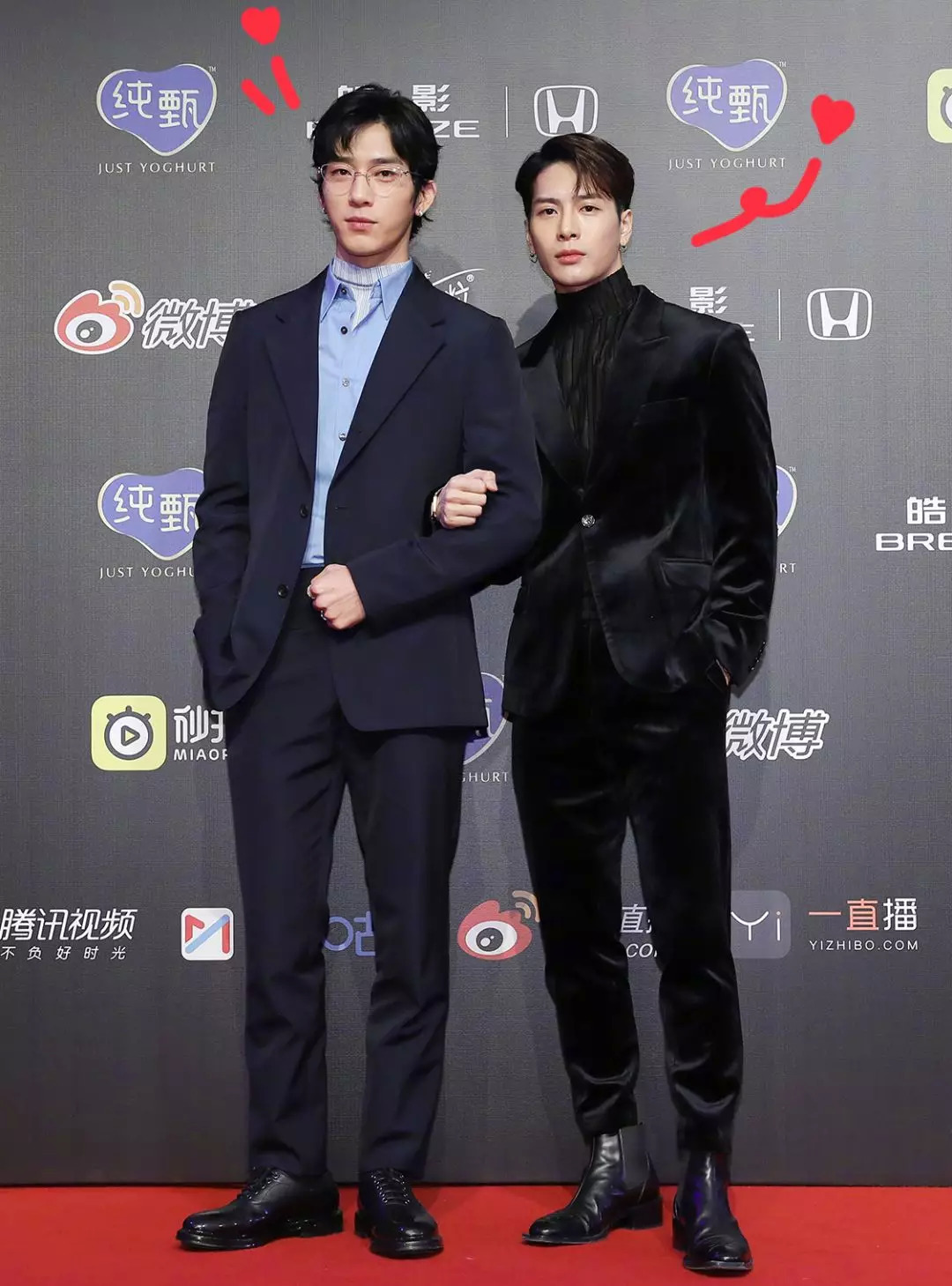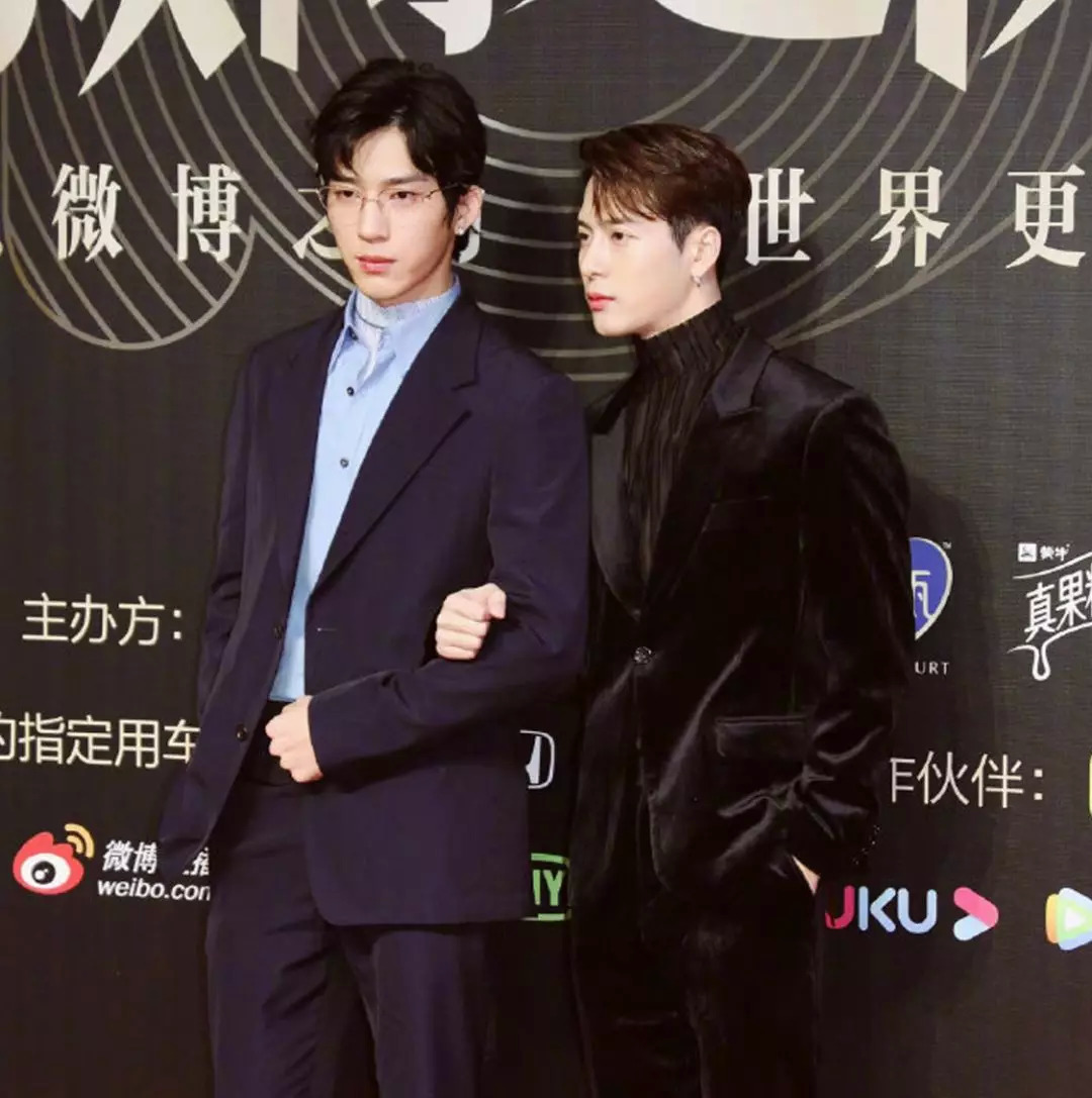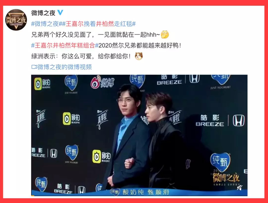 这对CP就是井柏然和王嘉尔。上周微博之夜,两个人把红毯走成了婚礼现场,像一对新人,手挽着手,心连着心。
