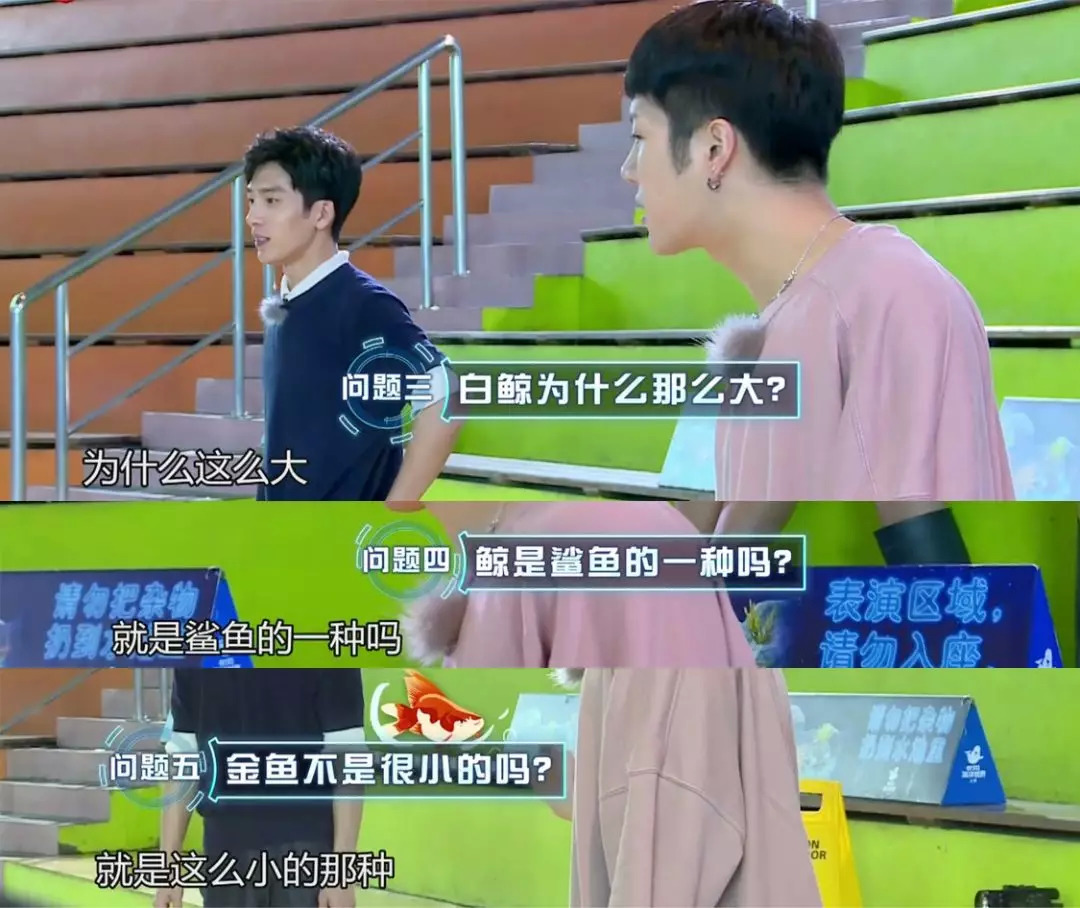 一起去海洋馆做任务时,王嘉尔是第一次见到白鲸,一脸呆萌,各种发问:白鲸是什么?白鲸为什么这么大?鲸是鲨鱼的一种吗???