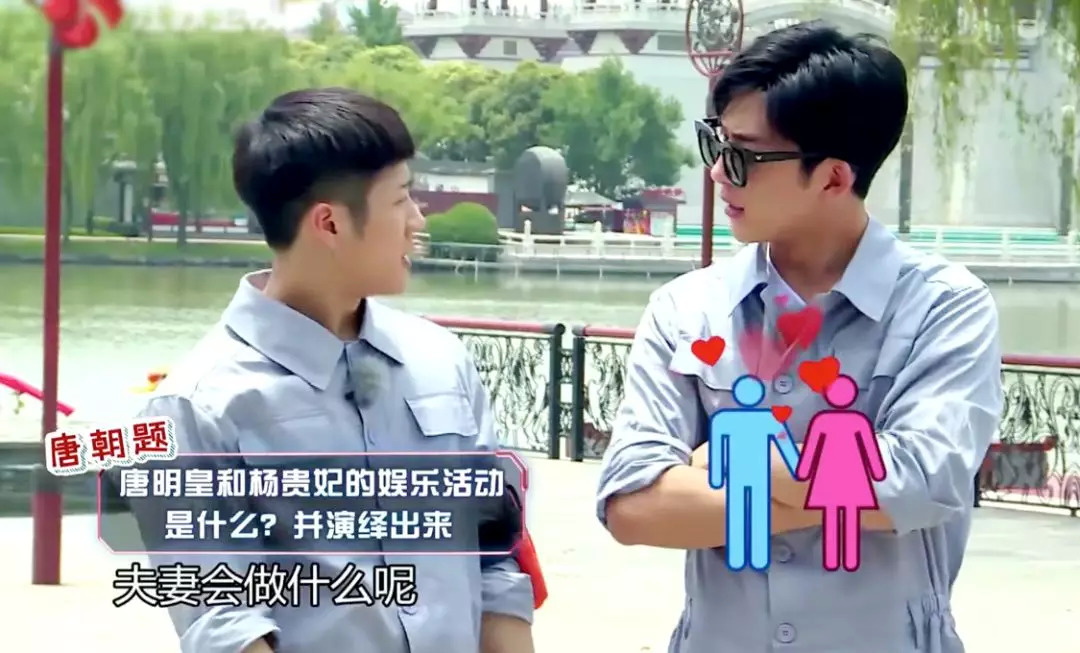 还有个“智力空间”环节,要他俩答题:唐明皇和杨贵妃业余生活的娱乐活动是什么,请演绎出来。