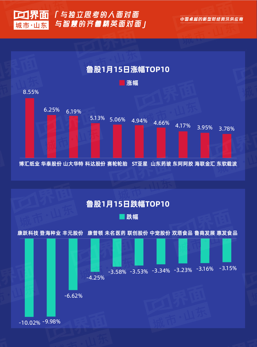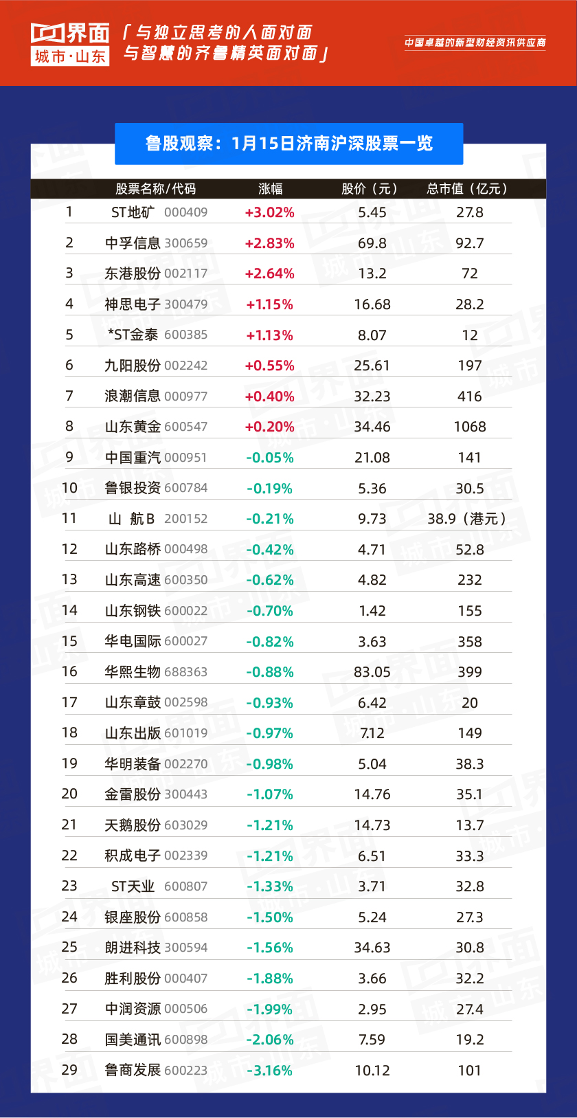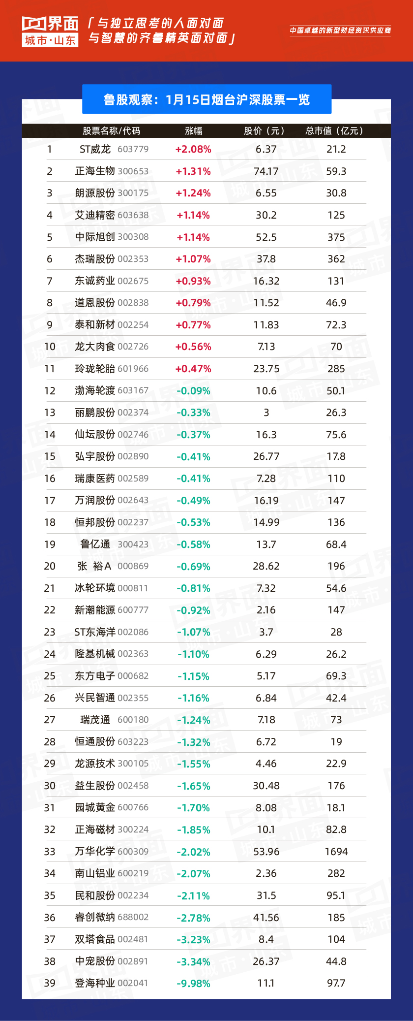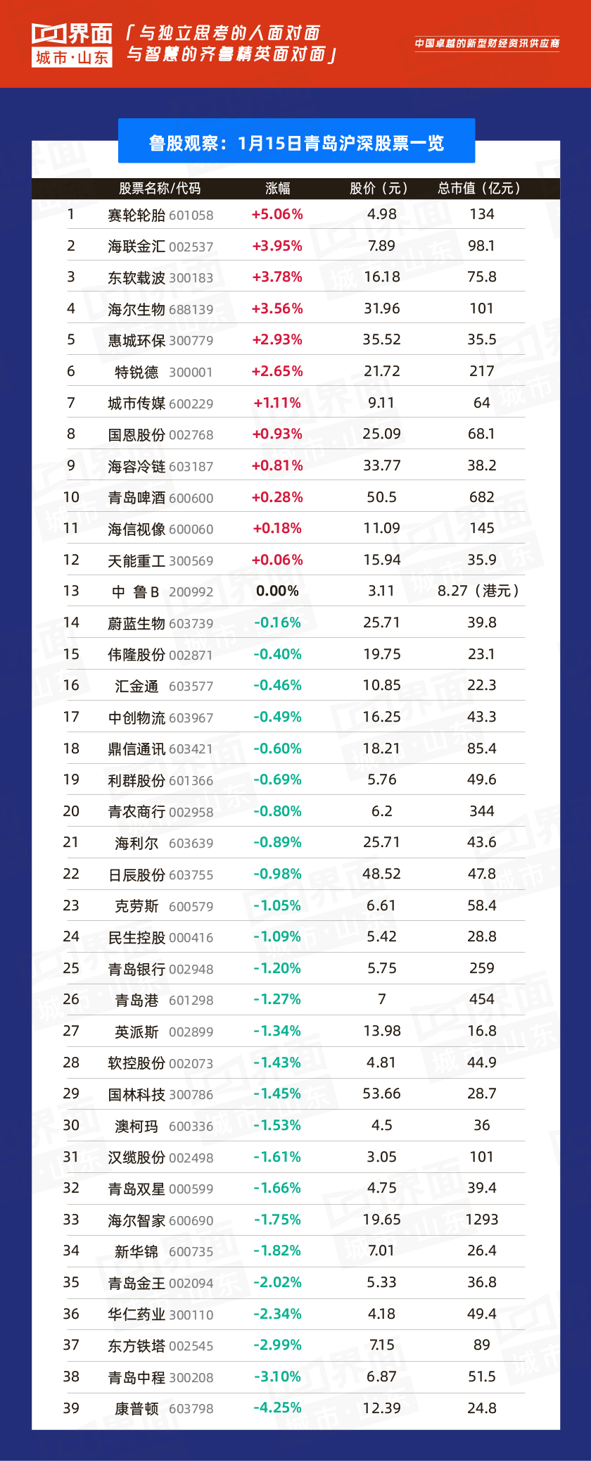 1月15日,山东省内沪深股票有65只个股上涨,136只下跌,3只与上一个交易日收盘价持平;总市值过千亿的有万华化学(600309)、海尔智家(600690)、潍柴动力(000338)、山东黄金(600547)共4家,500亿-1000亿的有3家,分别是青岛啤酒(600600)、歌尔股份(002241)和兖州煤业(600188)。