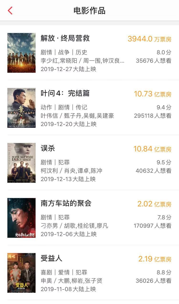 2019年这个原本有些“平平无奇”的贺岁档,在2020年春节档前出现了两部破10亿电影之后,气氛似乎缓和了几分。虽然电影市场依旧维持着“山雨欲来”前的宁静,但是《误杀》和《叶问4:完结篇》(以下简称《叶问4》)的长尾票房让行业显得不那么无米下炊。