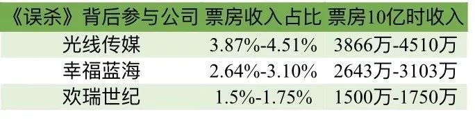 《误杀》成为贺岁档最大黑马,票房持续发挥长尾效应,出乎市场意料。2019年12月29日《误杀》上映17天,累计票房收入(含服务费)7.76亿,光线传媒公告显示,公司源于此片的票房收入区间为3000万至3500万;欢瑞世纪公司源于此片的营收收入为1164万至1358万;截止2020年1月1日24时,《误杀》上映20天,累计票房达到8.7亿,幸福蓝海于此片的分账收入区间约为2300万至2700万。