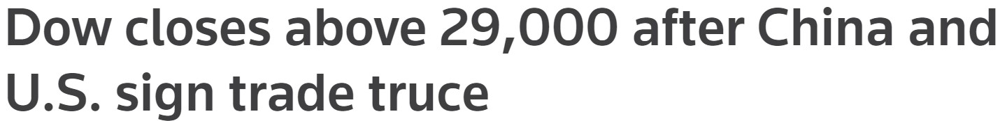 【经贸协议利好推动道琼斯指数收于29000点之上】在中美签署第一阶段经贸协议之后,道琼斯指数周三首次收于29000点之上,标普500指数也收于创纪录高点。