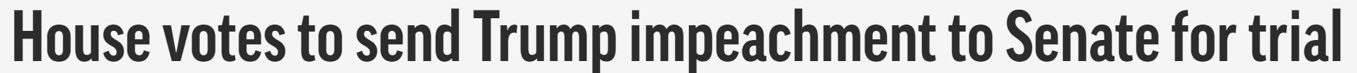 此次投票的结果为228票对193票,从而将特朗普弹劾案民主党控制的众议院转到共和党占多数的参议院。据匿名政府高级官员表示,总统团队预计参议院审判不超过两周,而且很快会脱罪。