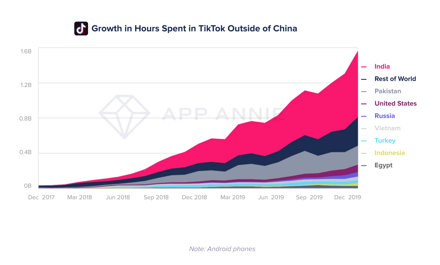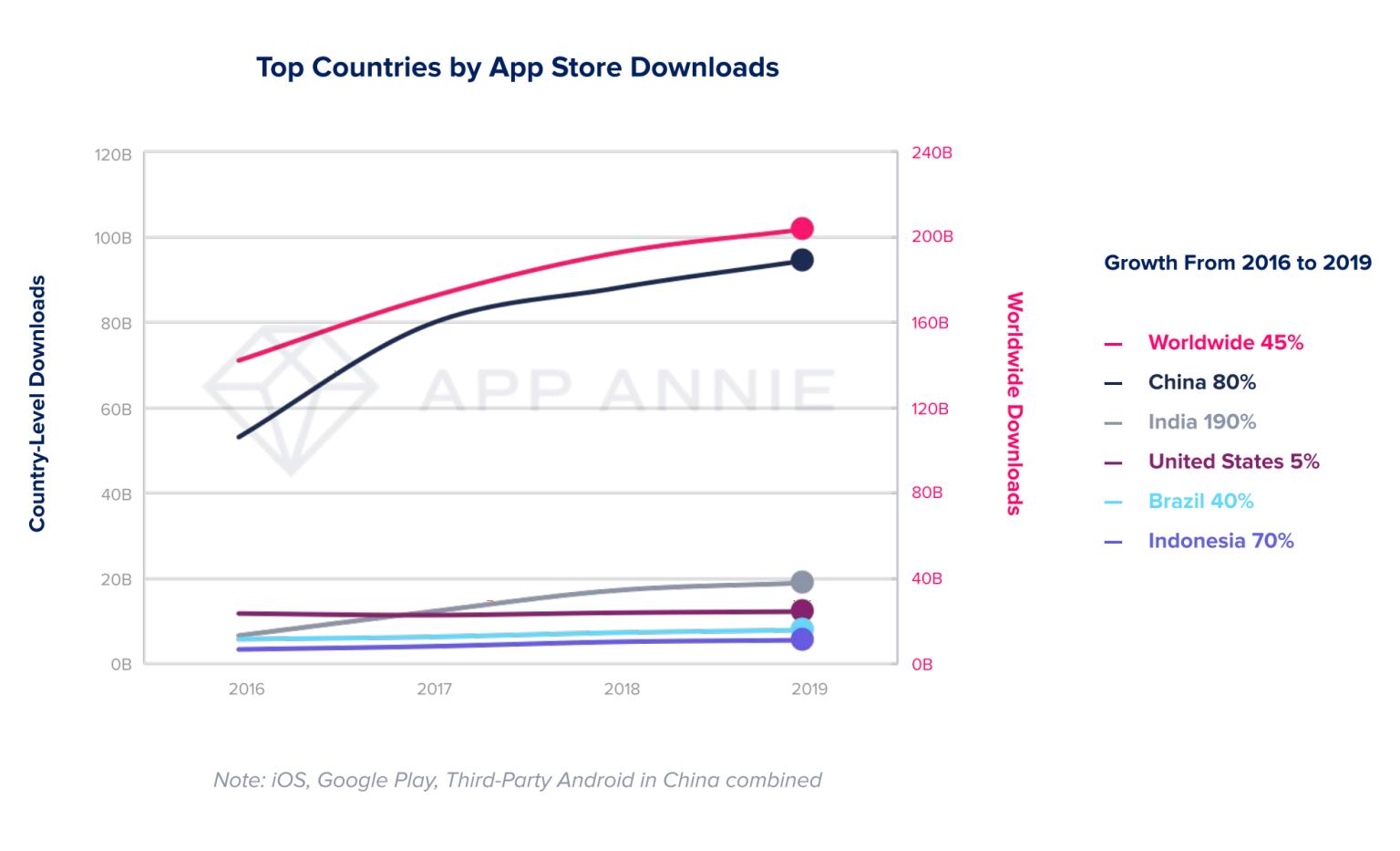 App Annie表示,2019年移动下载量的创纪录增长可归因于印度、巴西和印度尼西亚等新兴市场,自2016年以来下载量分别飙升了190%,40%和70%。同时,在同一时期,美国的下载量增速已放缓至5%,而中国则增长了80%。