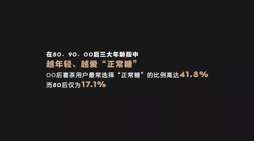 00后喜茶用户最常选择“正常糖”的比例高达41.8%,而80后仅为17.1%。80、90、00后三大年龄段中,越年轻越喜爱“正常糖”。