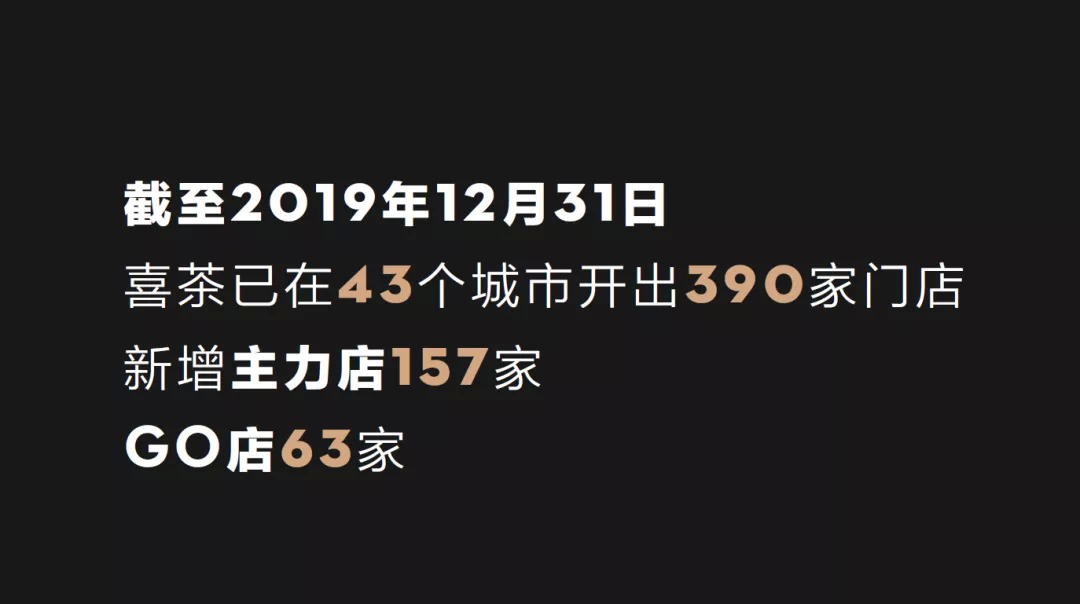 2019年,喜茶新增220家店。其中新增主力店157家,GO店63家,包括多个茶空间店、城市LAB店等概念店。