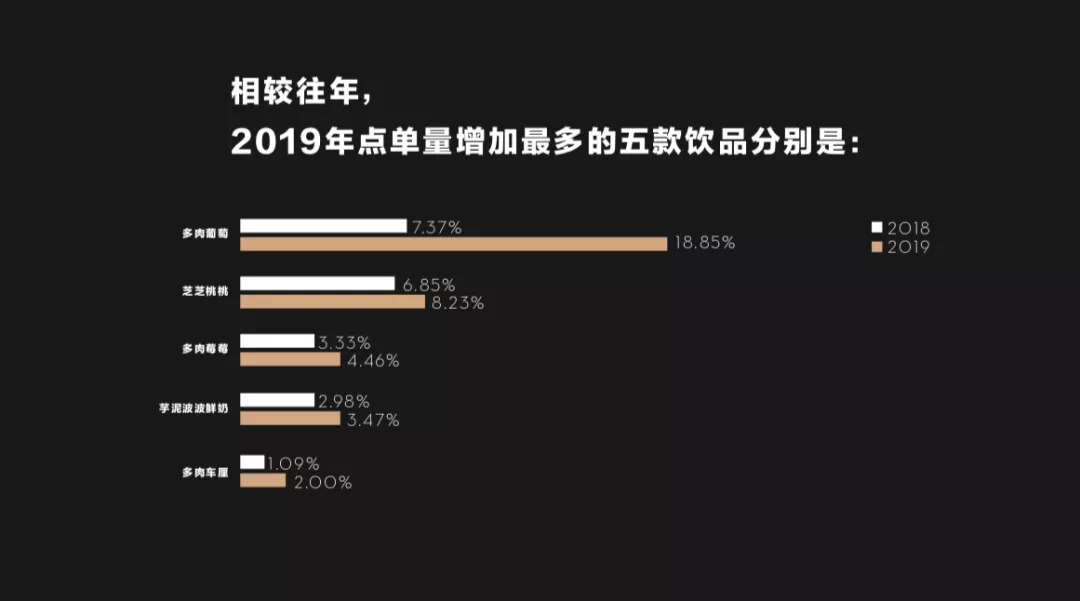 产品点单量:相较2018年,2019年多肉葡萄点单量增加了一倍以上,占比达到18.85%,受到消费者的广泛喜爱。芝芝桃桃、多肉莓莓、芋泥波波鲜奶、多肉车厘等产品都有不同程度的增加。