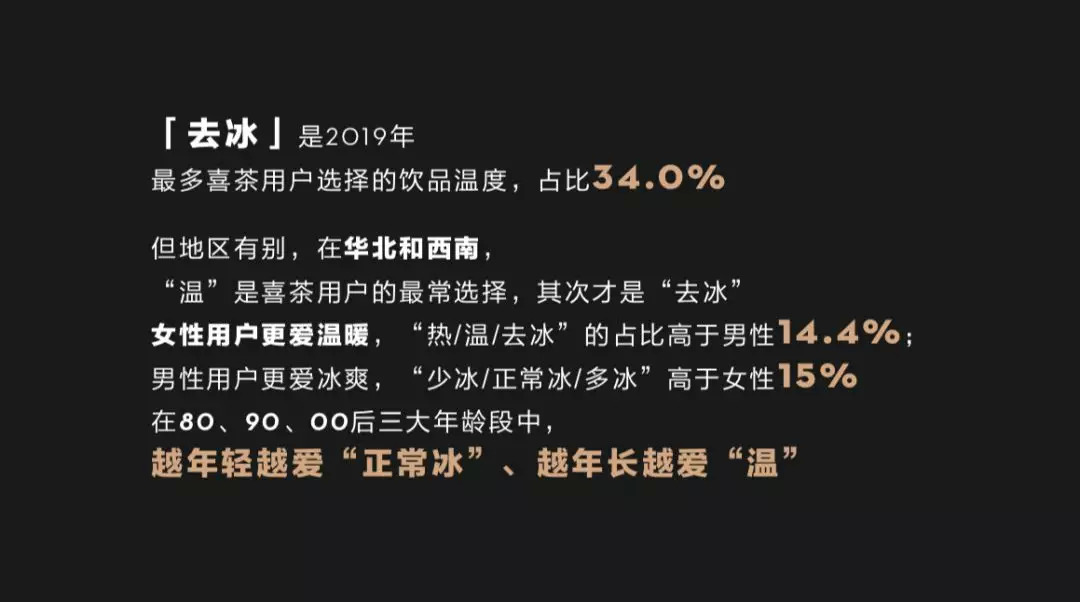 温度:“去冰”是2019年喜茶消费者选择最多的温度,占比34%。但地区有别,在华北和西南,“温”是喜茶用户的最常选择,其次才是“去冰”。地区和气候也是影响消费者选择的因素。