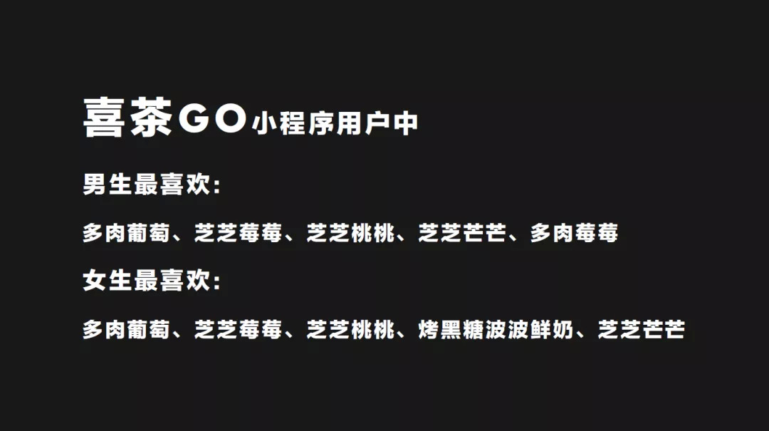 产品喜好:喜茶GO小程序用户中,男女生喜欢的产品较为相似,都包括多肉葡萄、芝芝草莓、芝芝桃桃、芝芝芒芒等产品。但男生还比较喜欢多肉莓莓,女生则更喜欢烤黑糖波波鲜奶。