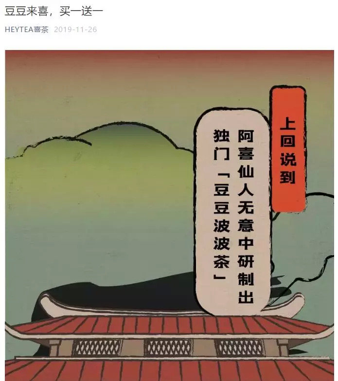 公众号:2019年,喜茶公众号单篇推文阅读量最高99万+,是喜茶2019年11月26日宣传豆豆波波系列的推文《豆豆来喜,买一送一》。