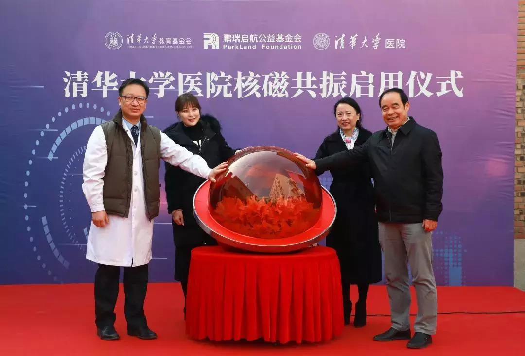 活动现场,鹏瑞启航公益基金会副理事长谷芳,清华大学副校长、总务长吉俊民,清华大学教育基金会秘书长袁桅,清华大学医院院长武剑共同启动触摸球,清华大学医院核磁共振启用仪式正式启幕。