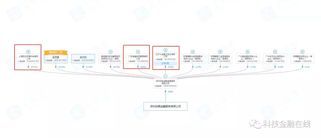 企查查信息显示,目前巨加网络持有旺金金融35.71%股份,为第一大股东,投哪网创始人吴显勇持股21.54%为第二大股东,上市公司大金重工持股4.54%为第六大股东。