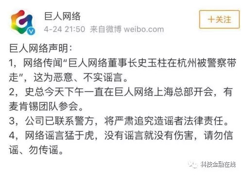 在团贷网出事之后,2019年4月份,一则关于巨人网络董事长史玉柱在杭州被警方带走的消息在社交平台上转发。