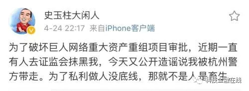 随后不久,史玉柱发微博称,为了破坏巨人网络重大资产重组项目审批,近期一直有人去证监会抹黑我,今天又公开造谣说我被杭州警方带走。为了私利做人没底线,那就不是人是畜生。