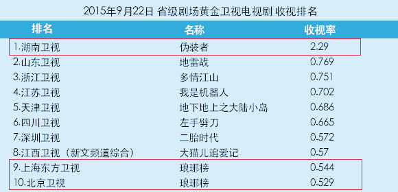 《伪装者》自开播以来势不可挡,根据CMS50城的统计,《伪装者》昨天的收视率为2.29,在黄金剧场电视剧中排名第一: