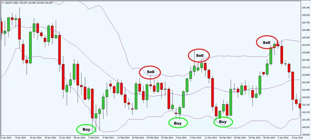 我的第一种交易策略是利用布林线来买低卖高。但是真正的交易和老师讲课完全是2个概念。比如老师的图是这样的: