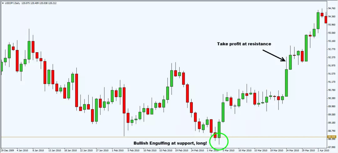 我觉得自己亏损的原因,是指标的滞后性。于是我开始分析价格本身。网络上对于价格走势交易的搜索结果有很多,教你“识别支撑位和阻力位”、“设置止损”、“风险回报比率”等等。一个事后的走势图如下: