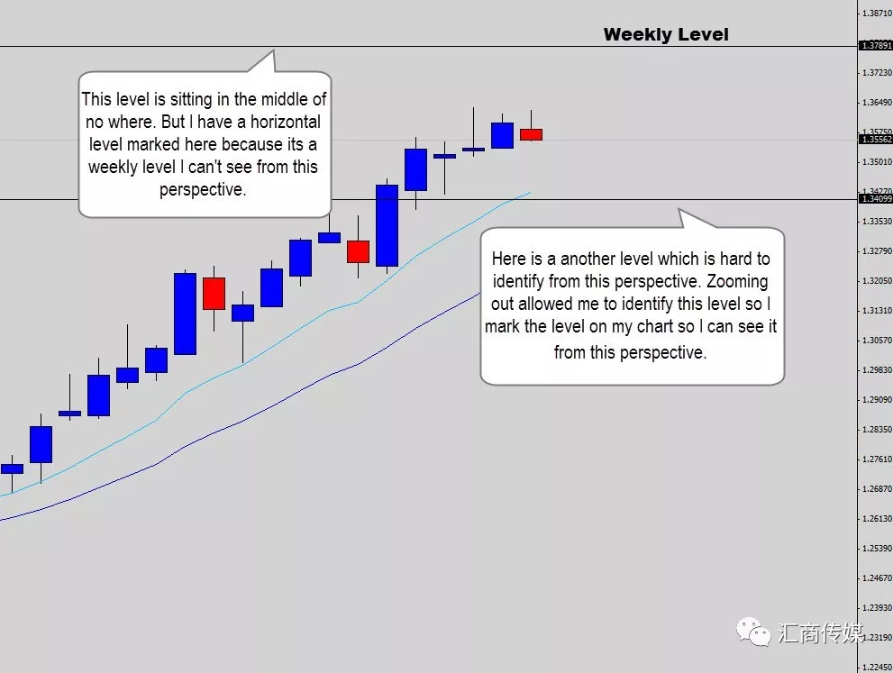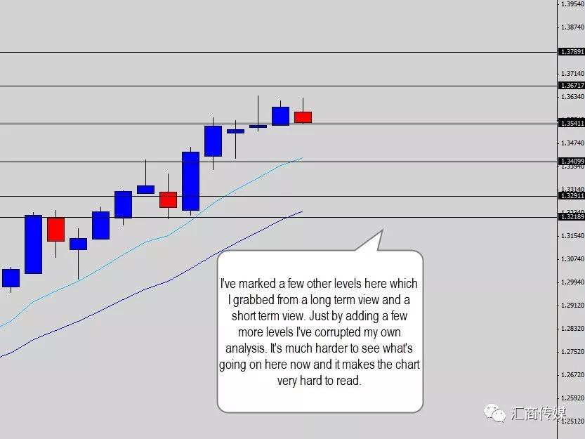 我自己在做分析时,会从一个中期的角度来看市场,比如从周图来看日图,这样更清晰。不需要标出每一个看到的价位,我需要的是和当前分析有关的价位。