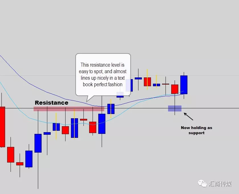 上面NZD/USD日图的阻力位接近教科书式完美,但是依然无法精确到点的方式标注出阻力位。在价格重新测试时,阻力位变成支撑位,但即使在这里,市场也不是完美遵循重要价位。因为市场充斥着力量的博弈,时时刻刻都在变化中。