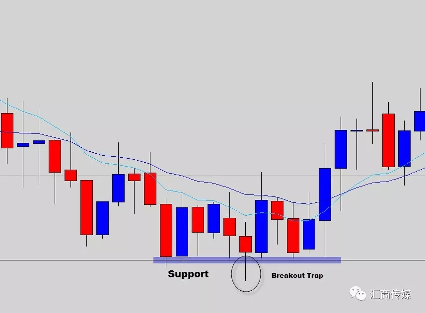上图也是一个类似的例子,再容易识别的支撑位,空方也在尝试“突围”,因此图表中出现了刺穿支撑位的影线。