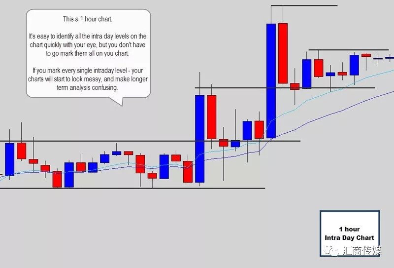 (图中译文:这是一个1小时图。很容易识别的日内价位就不需要标注出来,否则这个图表将变得非常凌乱无序。)