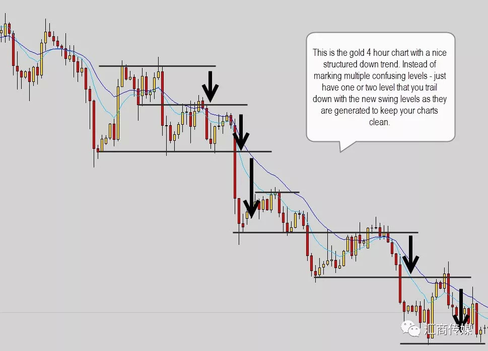 (图中译文:这是黄金4小时图,趋势是明显的看跌。无需画很多令人困惑的价位,一到两个价位然后随着价格波动往下移动即可让你的图表简洁明了。)