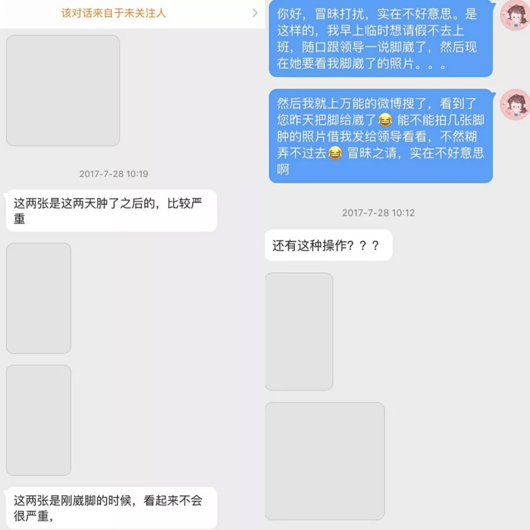 当年为了不去上班,编造了脚崴了的谎言,结果被领导要求看照片,无奈之下微博搜了关键词,还真找到一个,求着人家给我发了照片。(事情过去太久,微博私信图片已经不显示了)