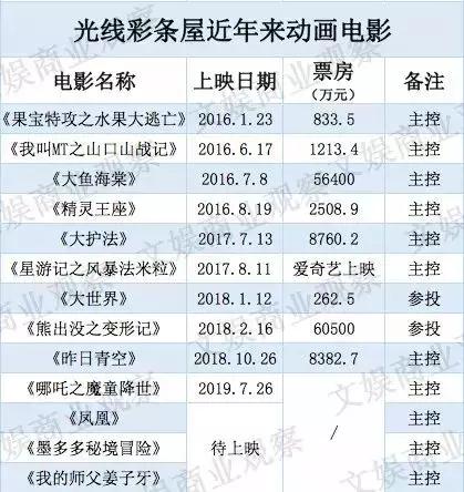 彩条屋的动画梦也开始走下坡路,除了2015年、2016年《大圣归来》《大鱼海棠》以及光线影业发行的《你的名字》票房尚佳。从2016年的《果宝特攻》《精灵王座》,到2017年的《烟花》《大护法》,再到2018年的《大世界》《昨日青空》,商业票房一直未过亿。