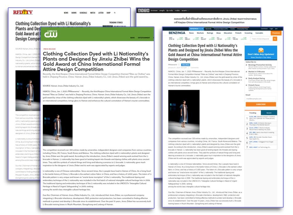 2019年底在中国浙江举办的“敦礼为衣”第三届柯桥·中国国际礼服设计大赛上,来自海南锦绣织贝实业有限公司的黎族植物染色服饰系列斩获金奖,引起国外媒体广泛关注。截至1月10日,累计有美国、英国、澳大利亚、马来西亚、泰国等230家亚太、欧美媒体网站刊发这一消息,累计浏览量逾8799万人次。