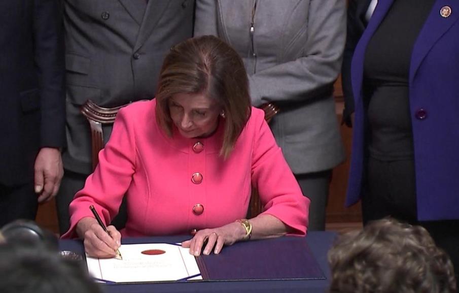 民主党控制的美国众议院在当地时间周三(1月15日)迎来高光时刻:议长佩洛西拿起一支钢笔,在弹劾总统特朗普的条款文件上签了自己的名字……的一个笔画。随后她不断换新的钢笔,每支笔也只用一个笔画,直至完成签名流程。