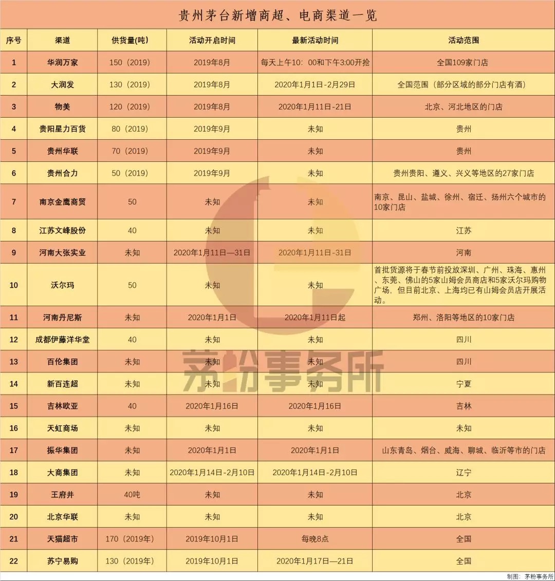 加上去年已开启合作的华润万家、物美、Costco,贵州三家本地商超以及河南丹尼斯等,和茅台成功牵手的商超卖场已达20家。