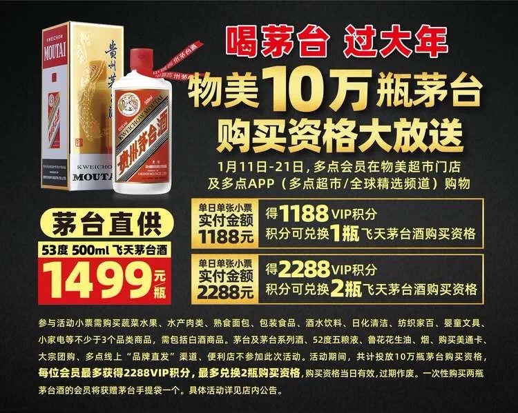 早在去年签约合作的物美在宣传中称,在1月11日- 21日活动期间,顾客单日单张小票实付金额满1188元可得1188VIP积分,积分兑换1瓶飞天茅台酒购买资格;对参与活动小票购买商品做出限制,且不能少于3个品类的商品;每位会员最多可兑换买2瓶53度飞天茅台酒购买资格,当日有效,过期作废。