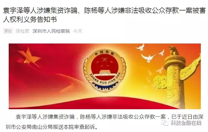 1月16日,深圳人民检察院对外披露,万盈金融袁宇泽等人涉嫌集资诈骗、陈杨等人涉嫌非法吸收公众存款一案(万盈金融案) 已于近日由深圳市公安局南山分局报送该院审查起诉。初步审计万盈金融未结清投资人有15560人,未结清总额为13.7亿余元。
