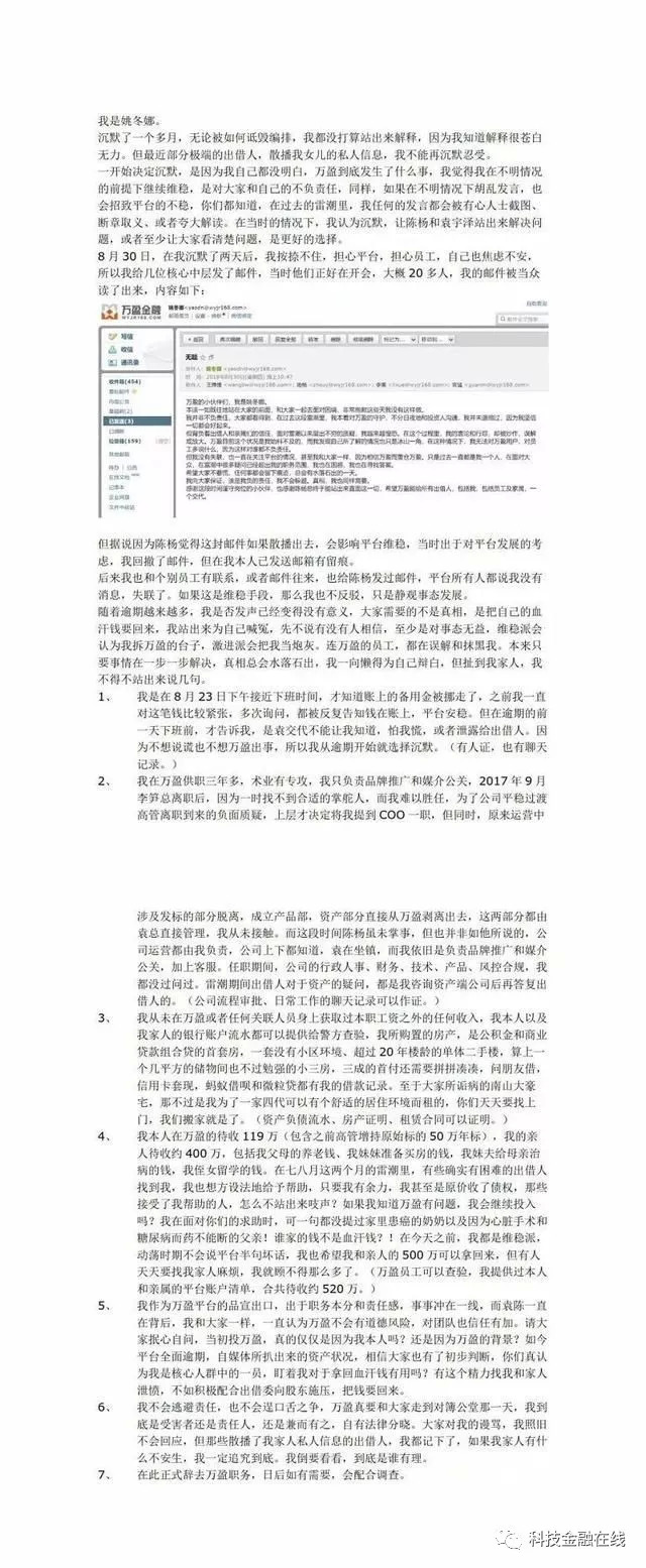 万盈金融首席运营官(COO)姚东娜也曾经发布一封公开信,称自己也是不明真相的高管。