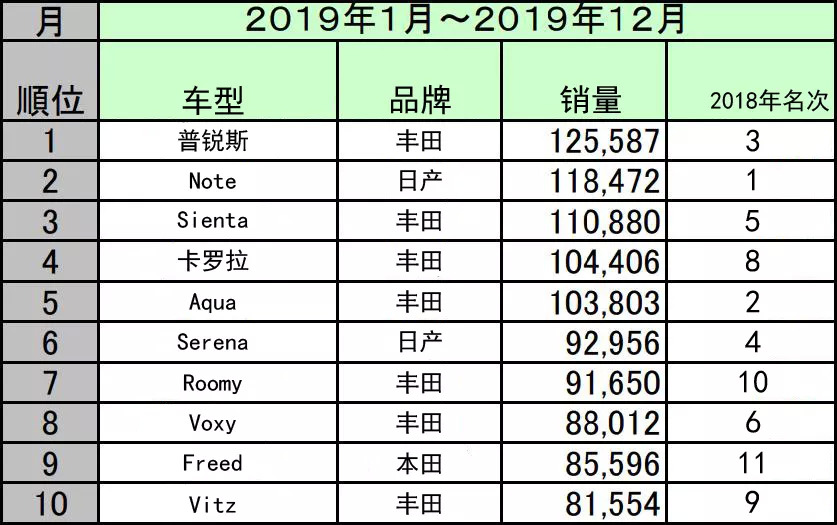 排名总体变化不大,普锐斯中期改款后依然是全日本最受欢迎的汽车,日产Note从2018年第一退到了原本该在的位置。但两者在2019年总销量差距极小,各月份分开来看会更明显些,有好几个月Note的销量都超过了丰田普锐斯。只不过在最终还是普锐斯略胜一筹,像极了国内的轩逸和朗逸。