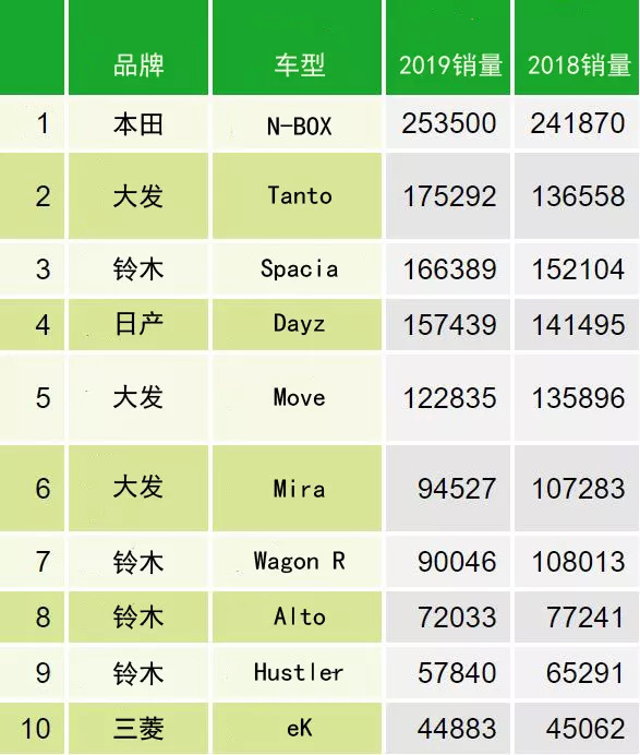 ▲2019年本土K-Car销量,本田和日产的K-car有着所有乘用车望尘莫及的销量规模