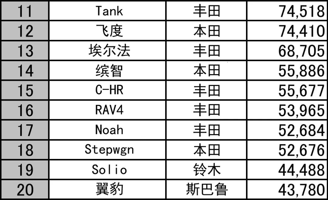 跟卡罗拉和雅力士同样待遇的还有新一代RAV4,不但彻底取代了日产奇骏的位置,成为日本本土市场紧凑级SUV全新的精神支柱,还在12月打入了销量前十。不过得益于价格低廉,奇骏还是有不少销量维持得住,出奇的是日产Serena,这款最畅销的MPV在下半年好几个月跌出了前十,不知道日产在搞什么。