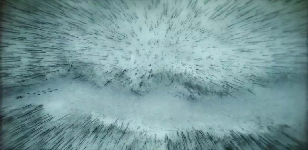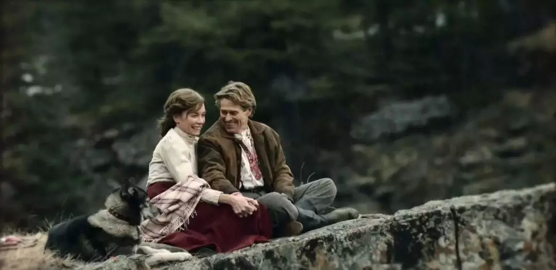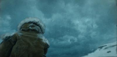 特别是那个雪橇犬队穿梭在森林里的俯拍画面:白雪覆盖大地的背景下,光秃的树木变成一根根紧凑杂乱的黑线。穿行蜿蜒于林中小路的雪橇队,在这样的上帝视角下,显得渺小脆弱而又无助,连前进的速度也因为这样的视角而变得缓慢。