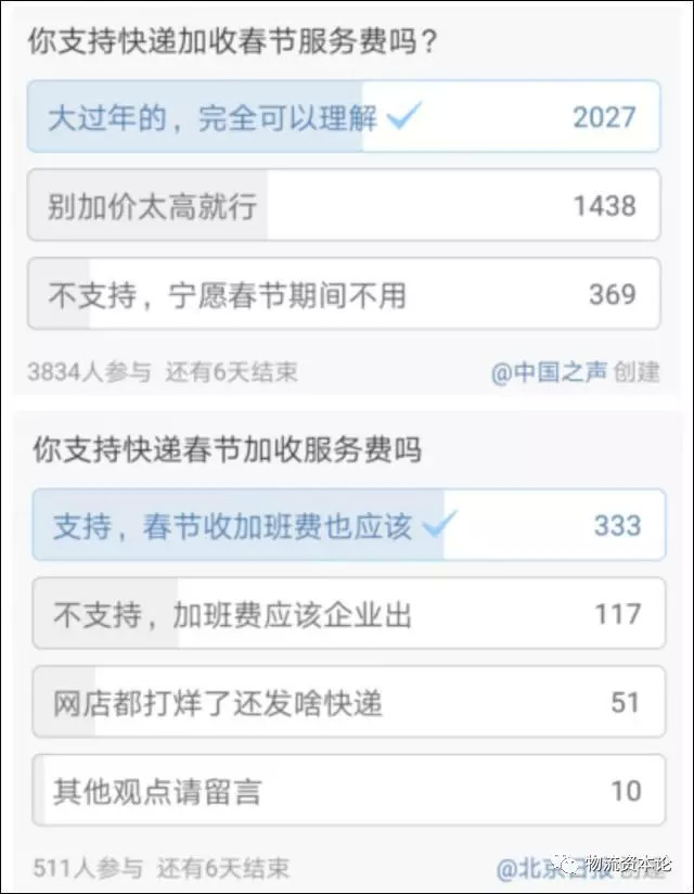 对于春节将加收服务费,网友普遍表示理解,仅苏宁物流明确称,春节期间不会涨价。