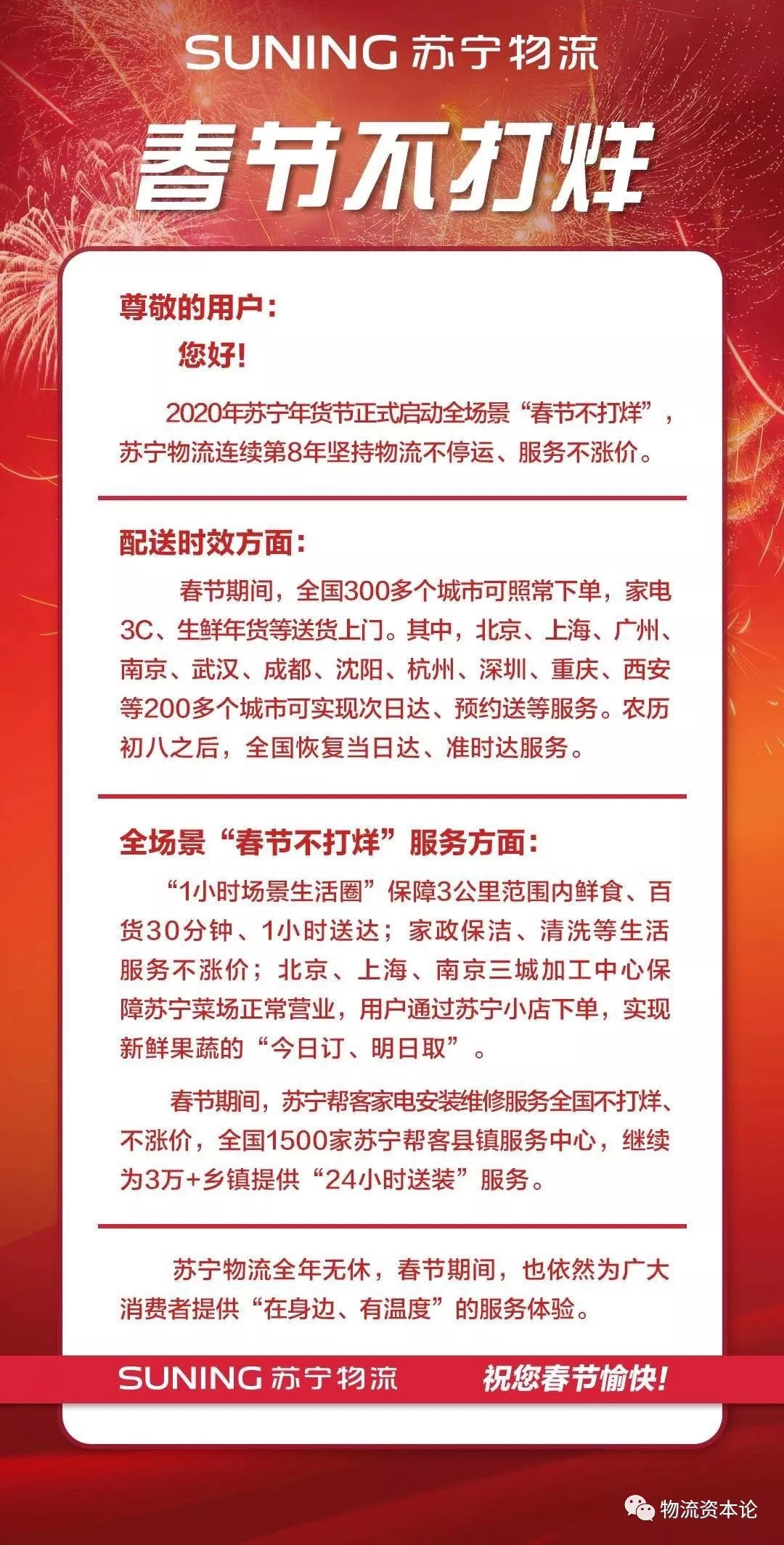 苏宁物流2019年12月26日发布通知,明确规定2019年底到2020年春节全场景的“春节不打烊”。