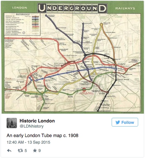 1931年,绘图员哈利∙贝克(Harry Beck)绘制了现在的地图的原型。图中所有线条都是直线,拐角一致为45度或90度。这幅富于现代主义的地图杰作把地底与地表混乱的街道相剥离。伦敦交通局的企划部门起初拒绝了这份设计提案。他们认为,这张地图会误导伦敦市民,使他们在估计站与站之间的真实距离时出现偏差。但试用后,事实证明他们错了。