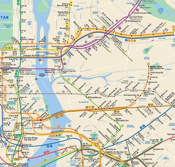 何苦要反复折腾这个清晰明了的路线图呢?如今的纽约地铁路线图并非大师玛西莫∙维格尼利1979年的作品,而是这个看似凌乱但准确反映地理位置的版本。